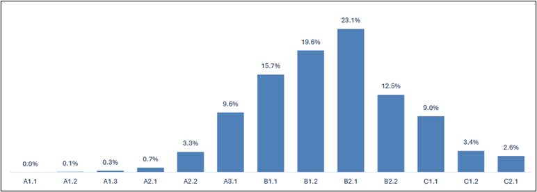 Chart illustrating the distribution of companies within their respective rating classes. The x-axis shows the ratings issued by the Agency, with each category representing the percentage of the total.