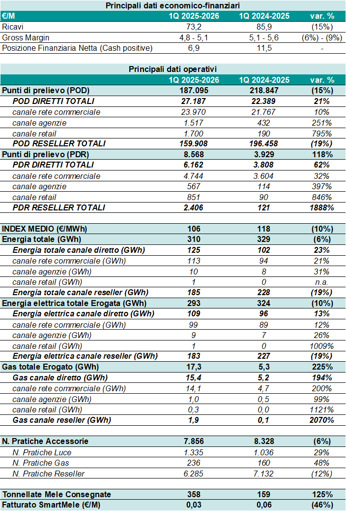 I punti di prelievo (POD) hanno registrato una riduzione del 15% (rispetto ai 218.847 POD gestiti nel periodo luglio 2024 – settembre 2024) attestandosi a quota 187.095, di cui 27 mila diretti (+21% YoY) e 160 mila (-19% YoY) gestiti dai 101 reseller abbinati a eVISO. Il numero di reseller rappresenta una quota del 13% circa del totale degli operatori di vendita al mercato libero censiti in Italia (786) nell’Elenco Venditori Energia Elettrica (EVE) redatto dal Ministero Ambiente e Sicurezza Energetica aggiornato alla data del 30.09.2025. Inoltre, nel numero totale dei POD è compresa una quota di clienti retail (1.700 POD) superiore di circa 9 volte ai 190 punti in fornitura nel periodo luglio 2024 – settembre 2024, coerentemente con la strategia aziendale di penetrare anche questo segmento.